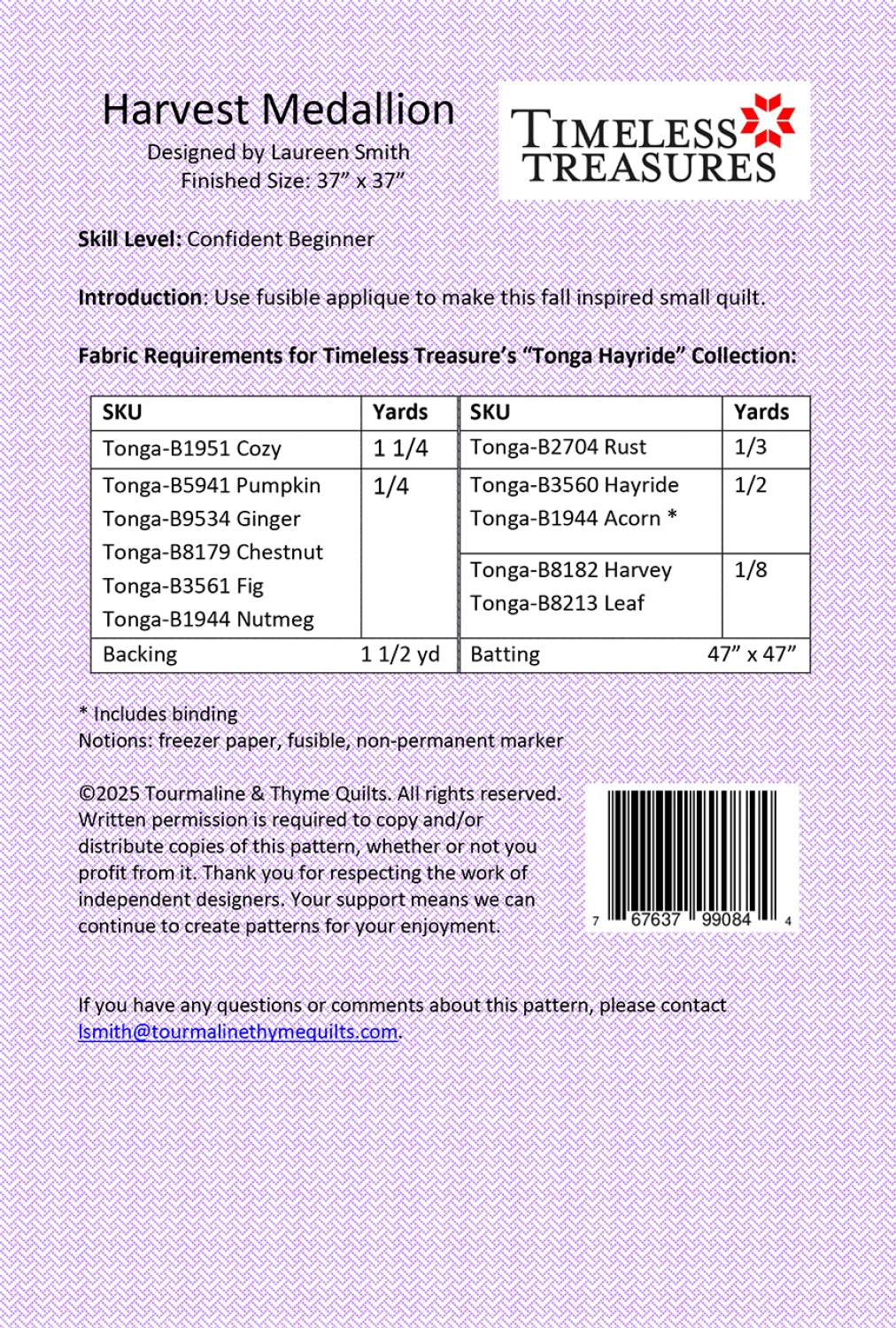 The Harvest Medallion pattern by Laureen Smith of Tourmaline & Thyme Quilts which includes full sized paper templates for tracing your applique.